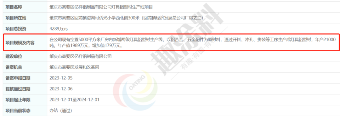 2023年12月6日,肇慶市高要區(qū)億祥鋁制品有限公司,燈具鋁型材生產(chǎn)線項目,在肇慶市高要區(qū)發(fā)展和改革局,進行企業(yè)投資項目備案。