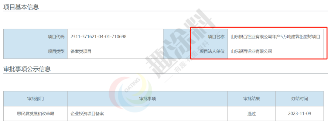 2023年11月9日,山東銀百鋁業(yè)有限公司,年產(chǎn)5萬噸建筑鋁型材項目,在惠民縣發(fā)展和改革局,進行企業(yè)投資項目備案。