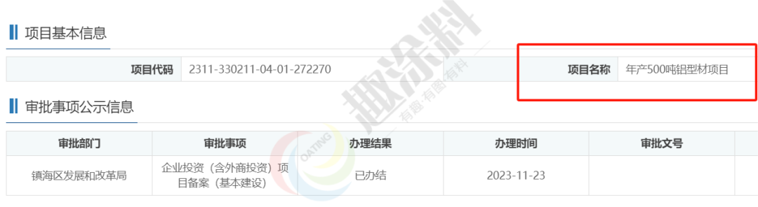2023年11月23日,寧波新銳鋁業(yè)有限公司,年產(chǎn)500噸鋁型材項目,在鎮(zhèn)海區(qū)發(fā)展和改革局,進行企業(yè)投資(含外商投資)項目備案(基本建設(shè))。