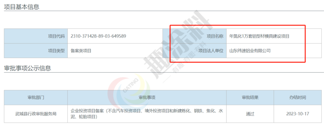 2023年10月16日,山東緯速鋁業(yè)有限公司,年氮化1萬套鋁型材模具建設(shè)項目,在武城縣行政審批服務(wù)局,進行企業(yè)投資項目備案。