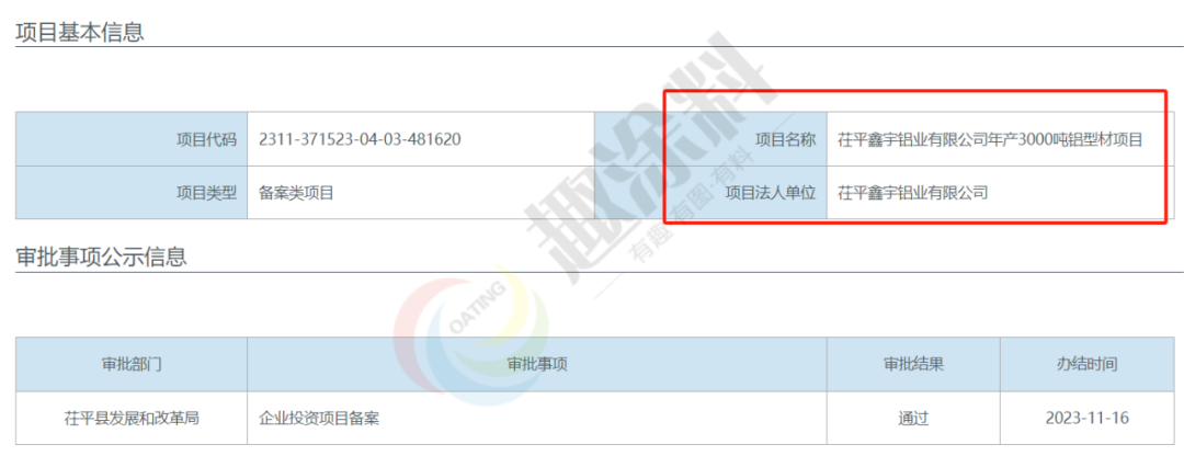 2023年11月16日,茌平鑫宇鋁業(yè)有限公司,年產(chǎn)3000噸鋁型材項目,在茌平縣發(fā)展和改革局,進行企業(yè)投資項目備案。