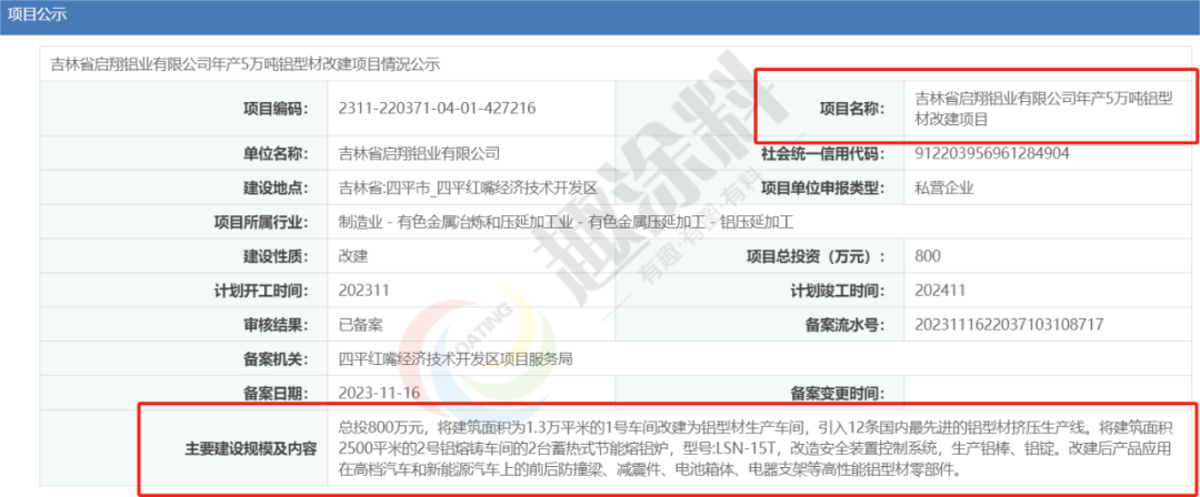 2023年11月16日,吉林省啟翔鋁業(yè)有限公司,年產(chǎn)5萬噸鋁型材改建項目,在四平紅嘴經(jīng)濟技術(shù)開發(fā)區(qū)項目服務(wù)局,進行企業(yè)項目備案。