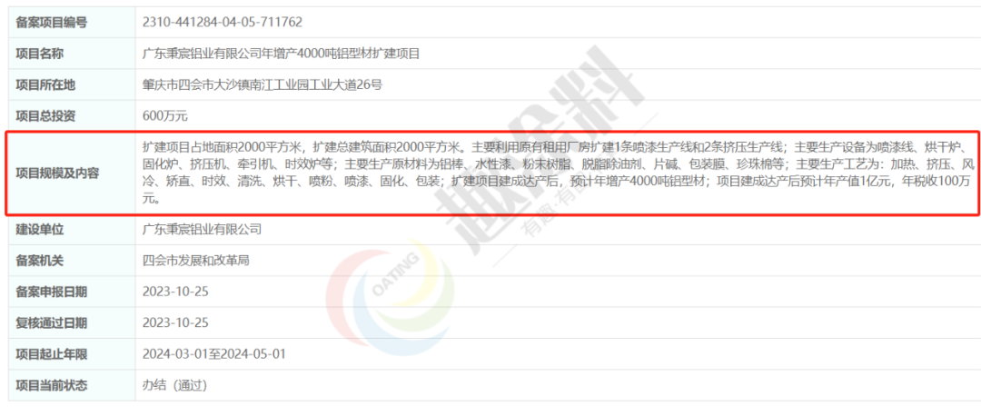 2023年10月25日,廣東秉宸鋁業(yè)有限公司,年增產(chǎn)4000噸鋁型材擴建項目,在四會市發(fā)展和改革局,進行企業(yè)投資項目備案。