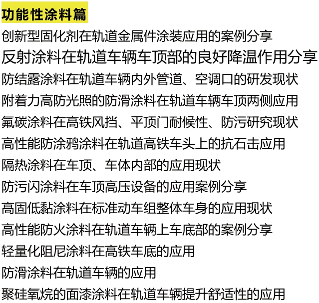 而低VOC、功能性、綠色環(huán)保是軌交涂料發(fā)展方向。軌道交通設備用涂料是指用于軌道交通設備的涂料,主要起到兩大作用:功能性和裝飾性。功能側(cè)重于基材的保護功能,這對車輛的所有部件幾乎同樣重要。由于工作條件不同,具體性能要求也有所不同。裝飾涂料強調(diào)外觀,主要涉及肉眼可及的表面。一般來說,裝飾涂料根據(jù)使用部位的不同,可分為外部裝飾涂料和內(nèi)部裝飾涂料。功能涂料主要包括轉(zhuǎn)向架的防護涂料、中空軸的石材抗沖擊涂料、減少連接車廂間空氣阻力的橡膠擋風玻璃涂料、降低噪音的阻尼涂料、車頂防滑涂料和電氣絕緣的絕緣涂料?!笆奈濉币?guī)劃明確提出鐵路車輛的綠色先進制造和快速發(fā)展目標,低VOC、功能性、綠色環(huán)保成為軌道交通涂料發(fā)展的方向。