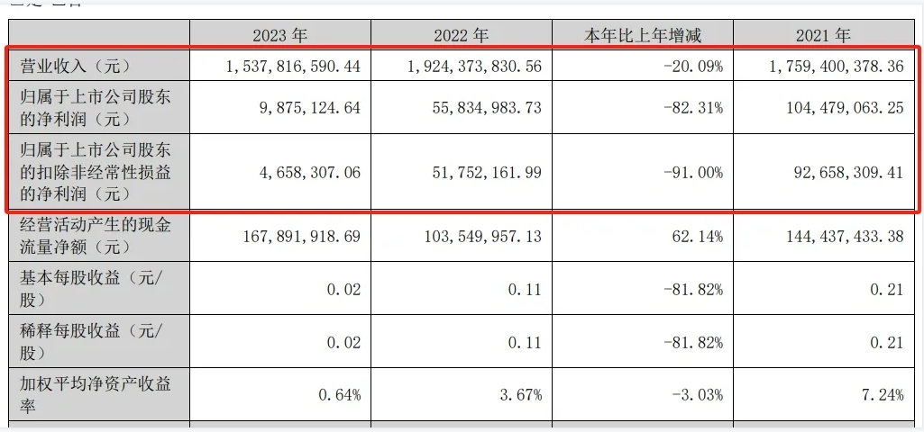 根據(jù)年報(bào)披露,2023年,正丹股份實(shí)現(xiàn)營(yíng)業(yè)收入15.38億元,同比下降20.09%;實(shí)現(xiàn)凈利潤(rùn)987.51萬元,同比下滑82.31%;實(shí)現(xiàn)扣非后凈利潤(rùn)465.83萬元,同比下滑91%。
