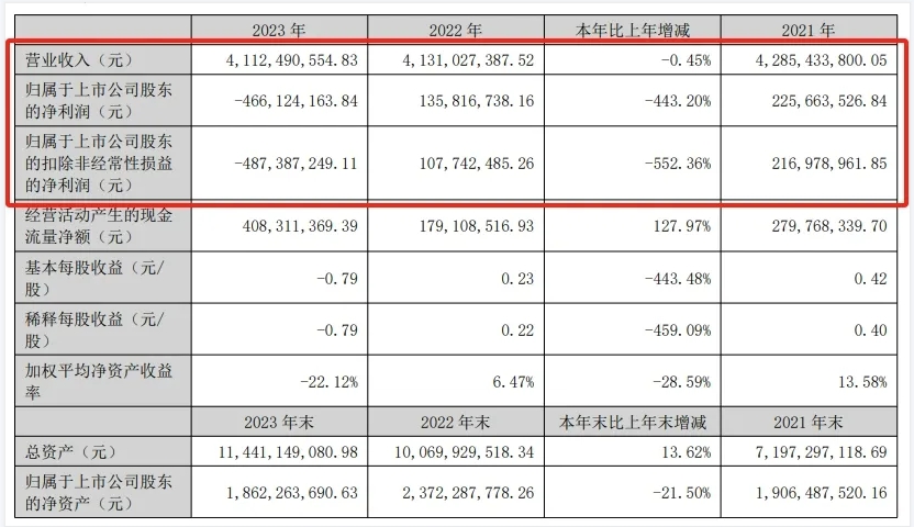 2023年,百川股份實(shí)現(xiàn)營(yíng)業(yè)收入41.12億元,同比下滑0.45%;實(shí)現(xiàn)凈利潤(rùn)-4.66億元,同比下滑443.2%;實(shí)現(xiàn)扣非后凈利潤(rùn)-4.87億元,同比下滑552.36%。