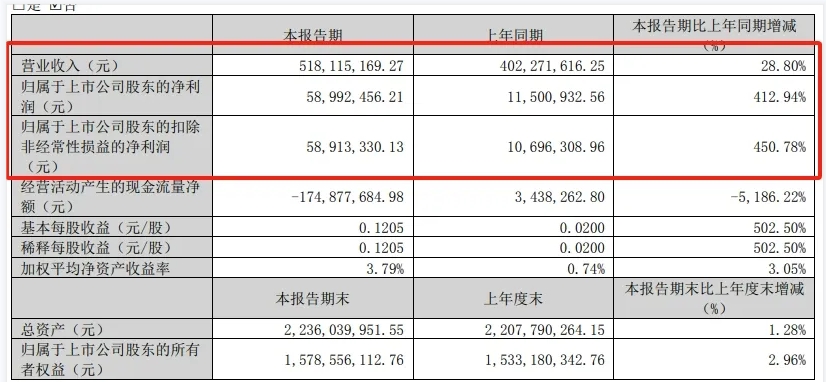 根據(jù)正丹股份剛剛披露的2024年第一季度財(cái)報(bào)顯示,公司在報(bào)告期內(nèi)實(shí)現(xiàn)營(yíng)業(yè)收入高達(dá)5.18億元,較去年同期增長(zhǎng)了28.8%。更令人矚目的是,正丹股份在報(bào)告期內(nèi)實(shí)現(xiàn)的凈利潤(rùn)達(dá)到了5899.25萬元,同比增長(zhǎng)了驚人的412.94%。