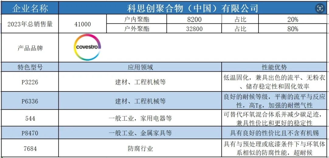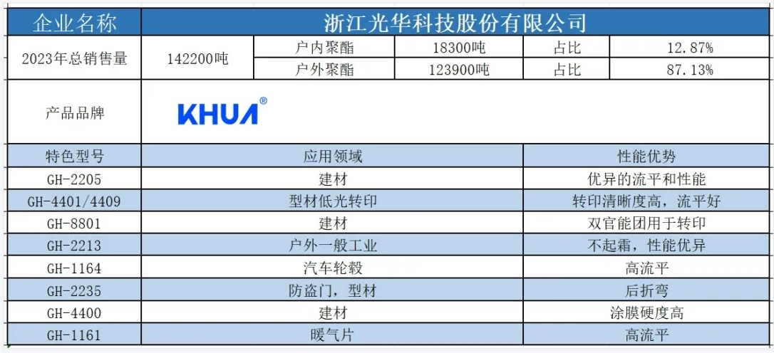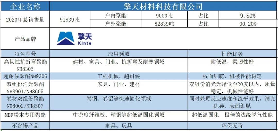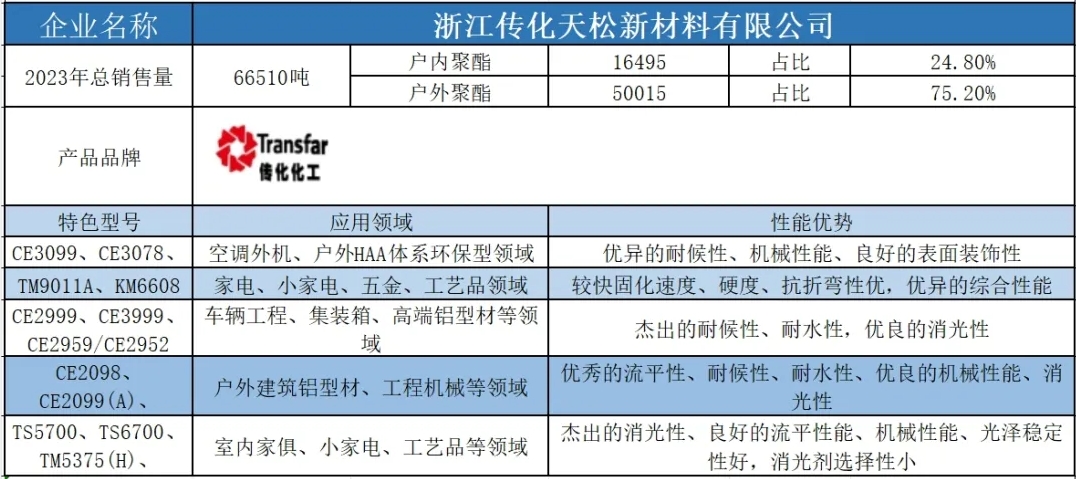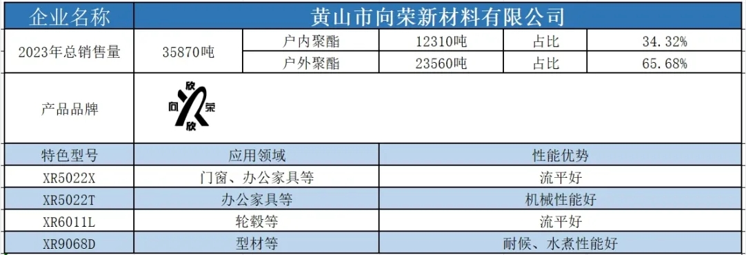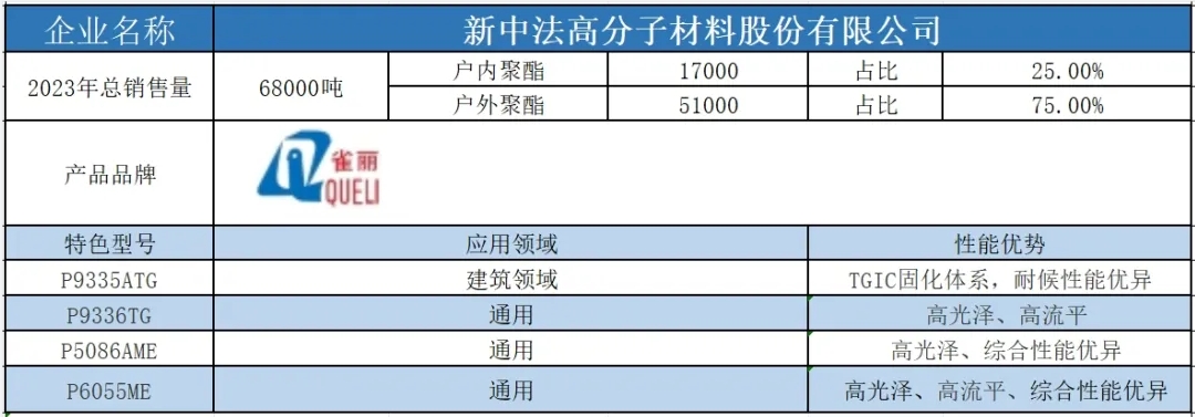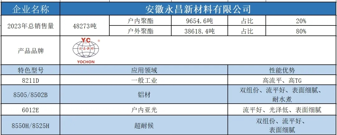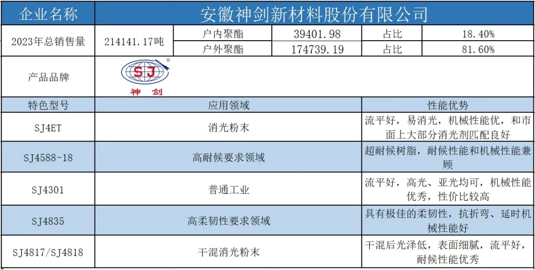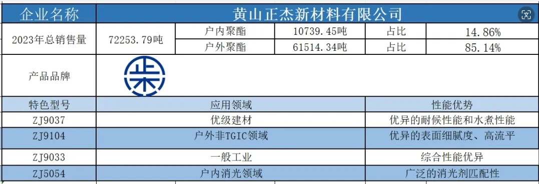 按照2023年粉末用聚酯樹(shù)脂銷(xiāo)售量依次排名,十強(qiáng)單位分別是安徽神劍新材料股份有限公司、浙江光華科技股份有限公司、擎天材料科技有限公司、煙臺(tái)楓林新材料有限公司、黃山正杰新材料有限公司、新中法高分子材料股份有限公司、浙江傳化天松新材料有限公司、安徽永昌新材料有限公司、科思創(chuàng)聚合物(中國(guó))有限公司、黃山市向榮新材料有限公司。(注:湛新樹(shù)脂(中國(guó))有限公司雖然在2023年的銷(xiāo)售量榜單上并未躋身前十,但其產(chǎn)值卻足以與榜單前十的企業(yè)一較高下。這家公司的專(zhuān)業(yè)性和產(chǎn)品質(zhì)量,無(wú)疑讓其在行業(yè)中獨(dú)樹(shù)一幟,值得我們的關(guān)注和認(rèn)可。)
