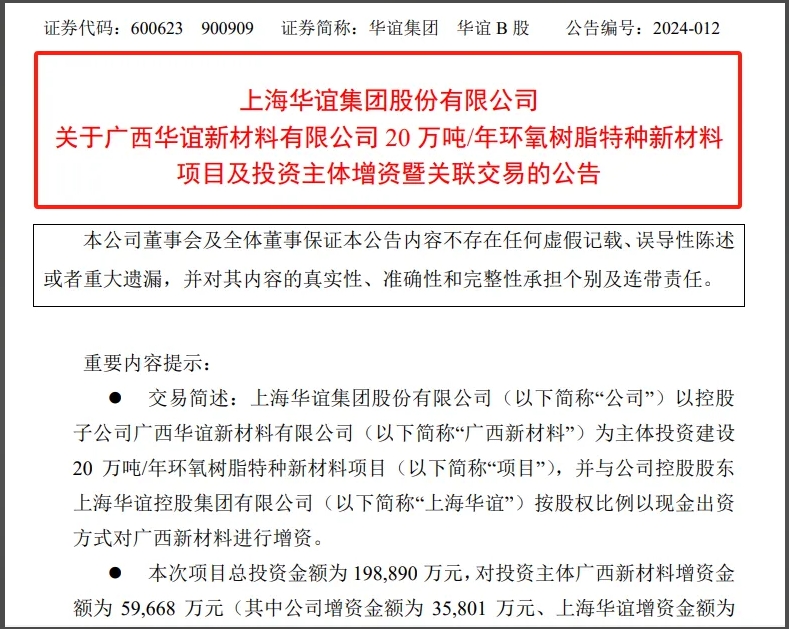 近日,華誼集團(tuán)對(duì)外發(fā)布《關(guān)于廣西華誼新材料有限公司20萬(wàn)噸/年環(huán)氧樹(shù)脂特種新材料項(xiàng)目及投資主體增資暨關(guān)聯(lián)交易的公告》。