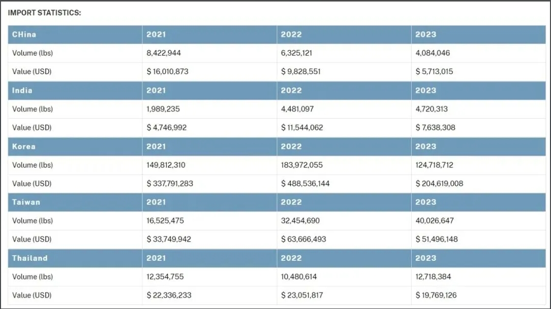 據(jù)美方統(tǒng)計,2023年美國自各涉案國家和地區(qū)進口被調(diào)查產(chǎn)品的金額分別約為:中國大陸571萬美元、印度764萬美元、韓國2億美元、臺灣地區(qū)5150萬美元、泰國1977萬美元;估計傾銷幅度為:中國:264.87~351.97%、印度:11.43~17.50%、韓國:30.01~69.42%、臺灣:87.19~136.02%、泰國:163.94~205.63%。