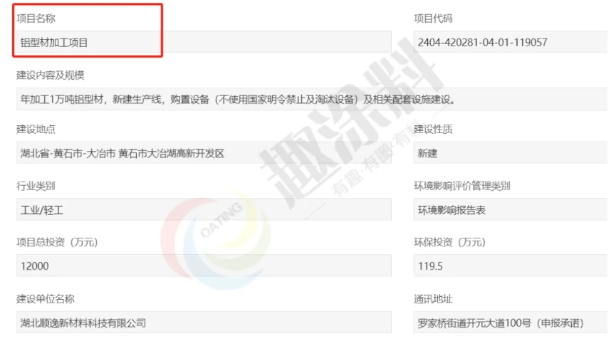 2024年4月26日,山東啟銘鋁業(yè)科技有限公司,年產(chǎn)3000噸工業(yè)鋁型材項目,進行企業(yè)投資項目備案。