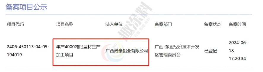 2024年6月18日,廣西諾豪鋁業(yè)有限公司,年產(chǎn)4000噸鋁型材生產(chǎn)加工項目,在廣西-東盟經(jīng)濟技術(shù)開發(fā)區(qū)管理委員會,進行企業(yè)投資項目備案。