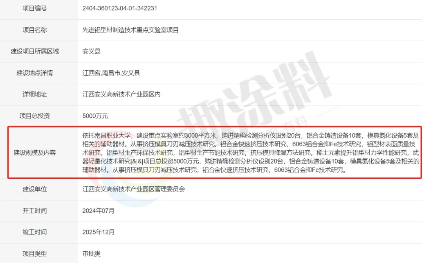 2024年4月,江西安義高新技術(shù)產(chǎn)業(yè)園區(qū)管理委員會,先進鋁型材制造技術(shù)重點實驗室項目,進行審批。
