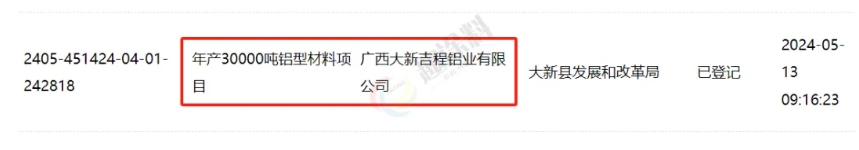 2024年5月17日,河南寶祥新材料科技有限公司,年產(chǎn)2000噸鋁型材項目,在鞏義市發(fā)改委,進行企業(yè)投資項目備案。
