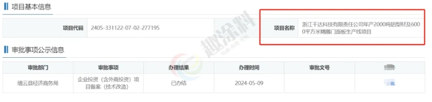 2024年6月19日,山東天衢鋁業(yè)有限公司,鋁型材智能化深加工項目,進行企業(yè)投資項目備案。
