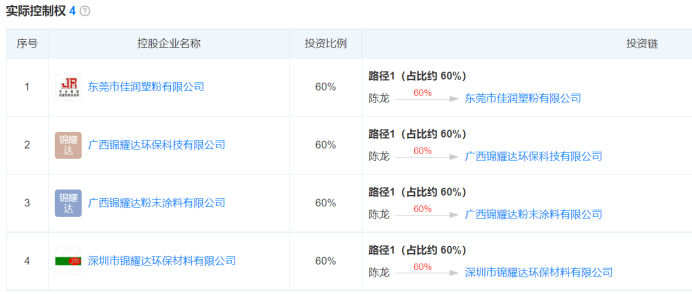 天眼查數(shù)據(jù)顯示,廣西錦耀達(dá)實(shí)控人為陳龍(持股60%)。陳龍擁有實(shí)際控制權(quán)的企業(yè)共有4家,除了廣西錦耀達(dá),還有東莞市佳潤塑粉有限公司、廣西錦耀達(dá)粉末涂料有限公司和深圳市錦耀達(dá)環(huán)保材料有限公司。經(jīng)營業(yè)務(wù)主要是粉末涂料產(chǎn)品。