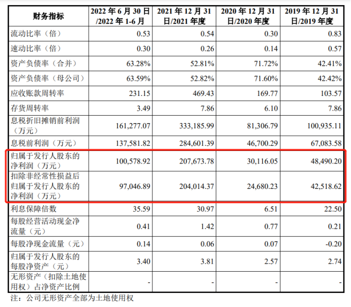 財報顯示,2019 年、2020 年、2021 年和 2022 年 1-6 月,海灣化學(xué)扣除非經(jīng)常性損益后的歸屬于母公司股東的凈利潤分別為4.25億元、2.47億元、20.4億元和 9.7億元,整體呈上升態(tài)勢。