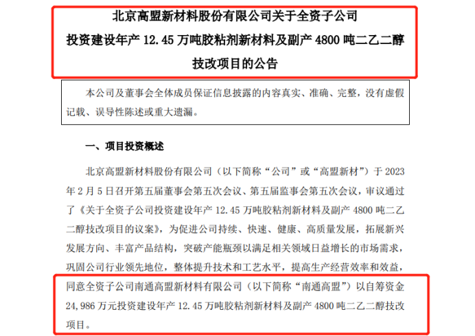 2023年2月6日,北京高盟新材料股份有限公司(以下簡稱“高盟新材”)對外發(fā)布公告稱,公司5日召開第五屆董事會第五次會議、第五屆監(jiān)事會第五次會議,審議通過了《關(guān)于全資子公司投資建設(shè)年產(chǎn)12.45萬噸膠粘劑新材料及副產(chǎn)4800噸二乙二醇技改項(xiàng)目的議案》。