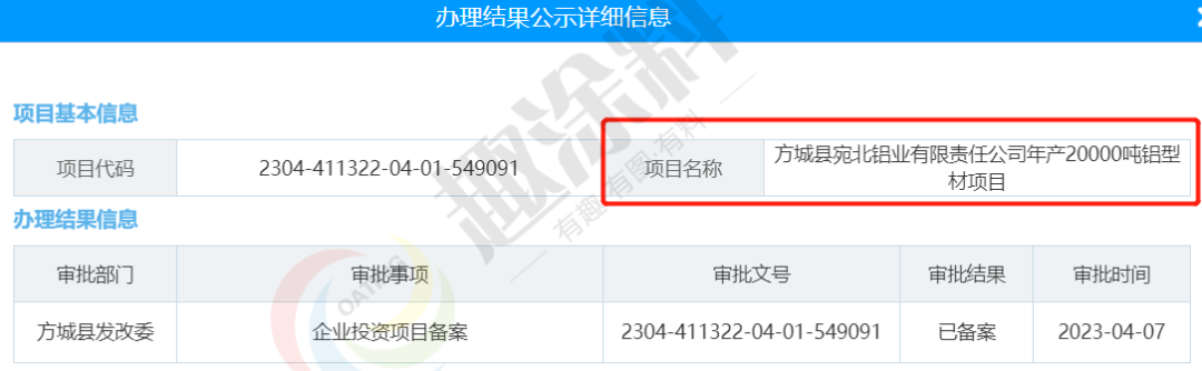 2022年4月7日,方城縣宛北鋁業(yè)有限責(zé)任公司,年產(chǎn)20000噸鋁型材項(xiàng)目,在方城縣發(fā)改委,進(jìn)行企業(yè)投資項(xiàng)目備案。
