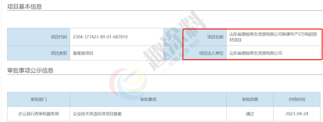 2022年4月22日,山東省鼎駿再生資源有限公司,新建年產(chǎn)2萬噸鋁型材項(xiàng)目,在慶云縣行政審批服務(wù)局,進(jìn)行企業(yè)技術(shù)改造投資項(xiàng)目備案。