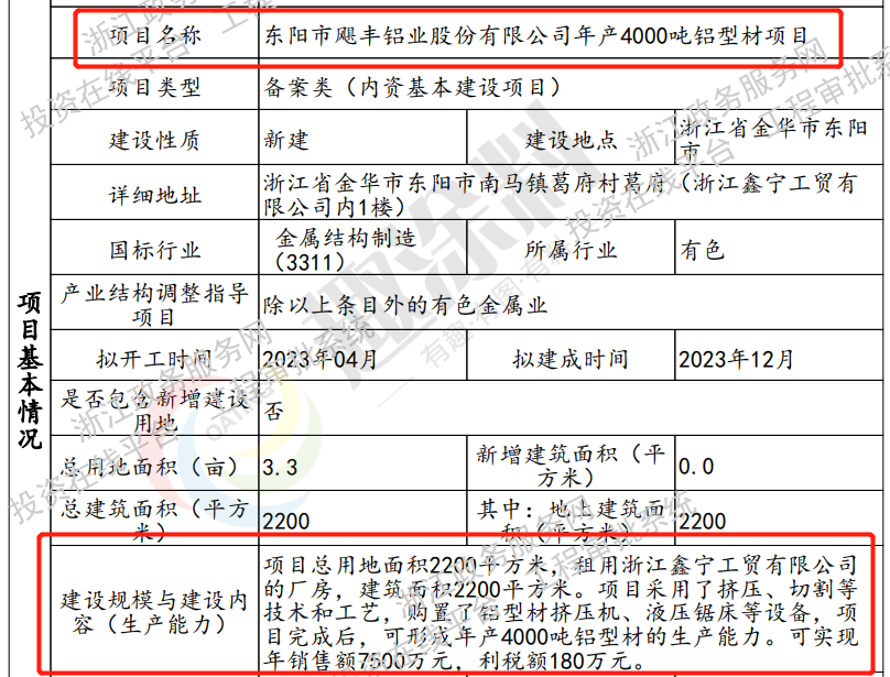 2022年4月17日,東陽市颶豐鋁業(yè)股份有限公司,年產(chǎn)4000噸鋁型材項(xiàng)目,在東陽市發(fā)展和改革局,進(jìn)行企業(yè)投資(含外商投資)項(xiàng)目備案(基本建設(shè))。