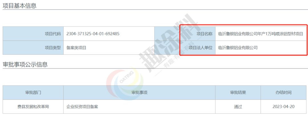 2022年4月17日,臨沂魯銀鋁業(yè)有限公司,年產(chǎn)1萬噸噴涂鋁型材項(xiàng)目,在費(fèi)縣發(fā)展和改革局,進(jìn)行企業(yè)投資項(xiàng)目備案。