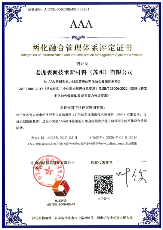 近日,TIGER打造的「環(huán)保塑粉訂單全流程管控能力」順利通過信息化和工業(yè)化管理體系認(rèn)證,獲得AAA級(jí)評(píng)定證書。AAA級(jí)是目前兩化融合管理體系可申請(qǐng)的最高等級(jí)認(rèn)證,目前江蘇太倉(cāng)市獲得兩化融合AAA級(jí)認(rèn)證的公司僅有十家。此次評(píng)定的通過,標(biāo)志著TIGER數(shù)字化轉(zhuǎn)型工作和行業(yè)智能化制造水平再次獲得權(quán)威認(rèn)可,是對(duì)企業(yè)綜合發(fā)展?jié)摿Φ木薮罂隙ā?/p>