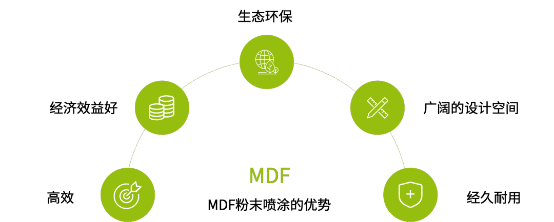 MDF噴粉技術(shù)在經(jīng)濟(jì)效益、涂層表面柔韌程度以及在家具產(chǎn)品設(shè)計(jì)效果上廣泛的可行性等方面,都顯示出了強(qiáng)大的潛力,同時(shí)它還具有VOCs零排放的環(huán)保性,并且將環(huán)保的概念已延伸到加工階段。