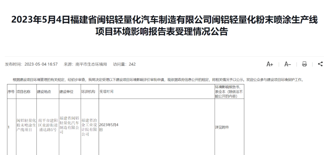 此6萬(wàn)套電池托盤的產(chǎn)能是現(xiàn)有工程“輕量化汽車智能制造基地與配套服務(wù)及軍民融合項(xiàng)目(三期工程)”中年產(chǎn)24 萬(wàn)套電池托盤的一部分,無(wú)新增電池托盤產(chǎn)能。日前,福建省南平市生態(tài)環(huán)境局對(duì)外發(fā)布《福建省閩鋁輕量化汽車制造有限公司閩鋁輕量化粉末噴涂生產(chǎn)線項(xiàng)目環(huán)境影響報(bào)告表受理情況公告》。