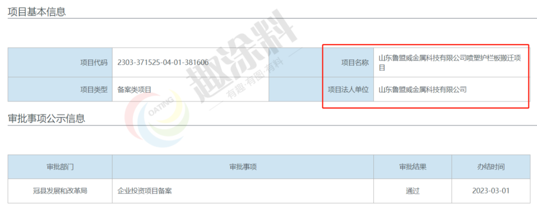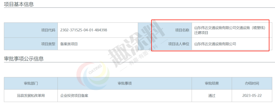 2023年2月27日,山東偉達(dá)交通設(shè)施有限公司,交通設(shè)施(噴塑線)遷建項(xiàng)目,在冠縣發(fā)展和改革局,進(jìn)行企業(yè)投資項(xiàng)目備案。