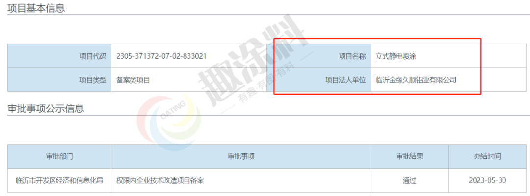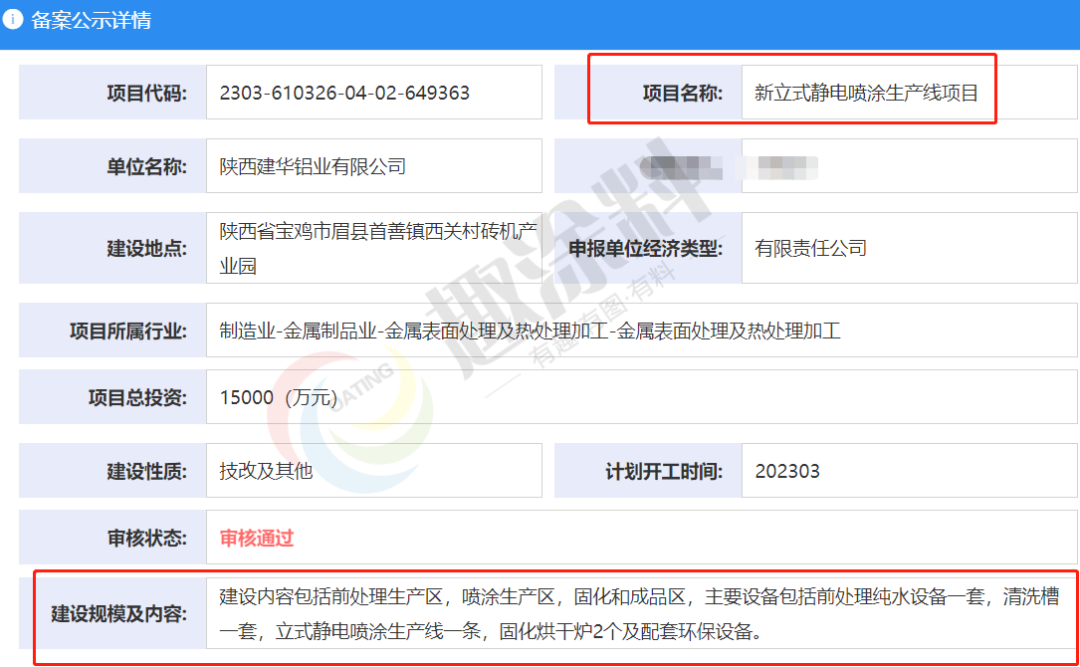 2023年3月2日,陜西建華鋁業(yè)有限公司,新立式靜電噴涂生產(chǎn)線項(xiàng)目,進(jìn)行企業(yè)項(xiàng)目備案。