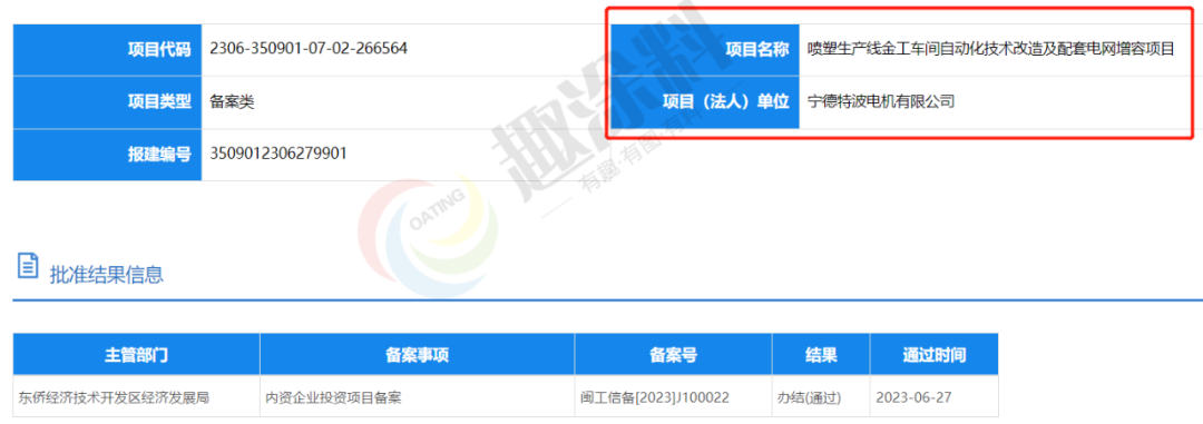 2023年6月27日,寧德特波電機(jī)有限公司,噴塑生產(chǎn)線金工車間自動化技術(shù)改造及配套電網(wǎng)增容項(xiàng)目,在東僑經(jīng)濟(jì)技術(shù)開發(fā)區(qū)經(jīng)濟(jì)發(fā)展局,進(jìn)行內(nèi)資企業(yè)投資項(xiàng)目備案。