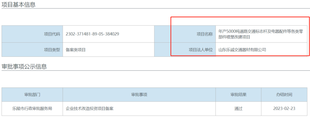 2023年2月22日,山東樂誠交通器材有限公司,年產(chǎn)5000噸道路交通標(biāo)志桿及電器配件等各類零部件噴塑改建項(xiàng)目,在樂陵市行政審批服務(wù)局,進(jìn)行企業(yè)技術(shù)改造投資項(xiàng)目備案。