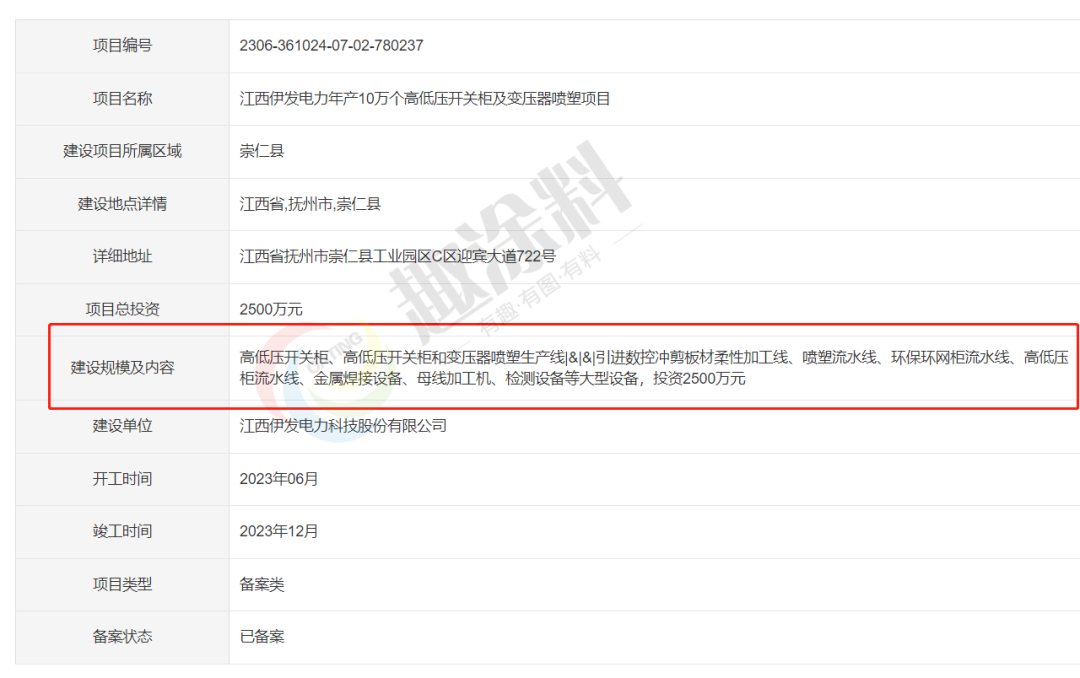 2023年6月2日,江西伊發(fā)電力科技股份有限公司,年產(chǎn)10萬個(gè)高低壓開關(guān)柜及變壓器噴塑項(xiàng)目,進(jìn)行企業(yè)項(xiàng)目備案。