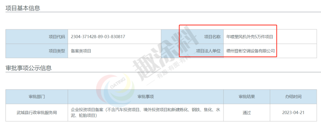 2023年4月20日,德州登彬空調(diào)設(shè)備有限公司,年噴塑風(fēng)機(jī)外殼5萬件項(xiàng)目,在武城縣行政審批服務(wù)局,進(jìn)行企業(yè)投資項(xiàng)目備案(不含汽車投資項(xiàng)目、境外投資項(xiàng)目和新建煉化、鋼鐵、焦化、水泥、輪胎項(xiàng)目)。