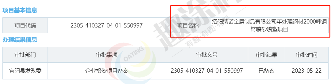 2023年5月22日,洛陽納諾金屬制品有限公司,年處理鋼材2000噸鋼材噴砂噴塑項(xiàng)目,在宜陽縣發(fā)改委,進(jìn)行企業(yè)投資項(xiàng)目備案。
