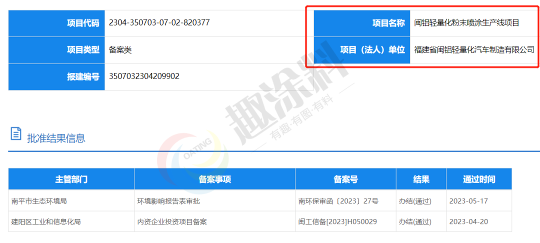 2023年4月20日,福建省閩鋁輕量化汽車制造有限公司,閩鋁輕量化粉末噴涂生產(chǎn)線項(xiàng)目,在建陽區(qū)工業(yè)和信息化局,進(jìn)行內(nèi)資企業(yè)投資項(xiàng)目備案。