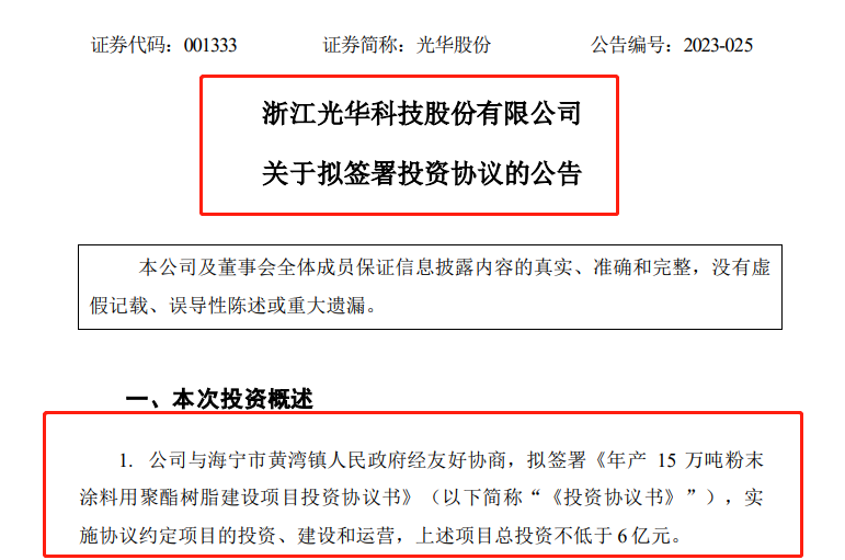 值得一提的是,2023年7月19日,光華股份對(duì)外發(fā)布《關(guān)于擬簽署投資協(xié)議的公告》。公告中指出,光華股份與海寧市黃灣鎮(zhèn)人民政府經(jīng)友好協(xié)商,擬簽署《年產(chǎn)15萬(wàn)噸粉末涂料用聚酯樹脂建設(shè)項(xiàng)目投資協(xié)議書》(以下簡(jiǎn)稱“《投資協(xié)議書》”),實(shí)施協(xié)議約定項(xiàng)目的投資、建設(shè)和運(yùn)營(yíng),上述項(xiàng)目總投資不低于6億元。