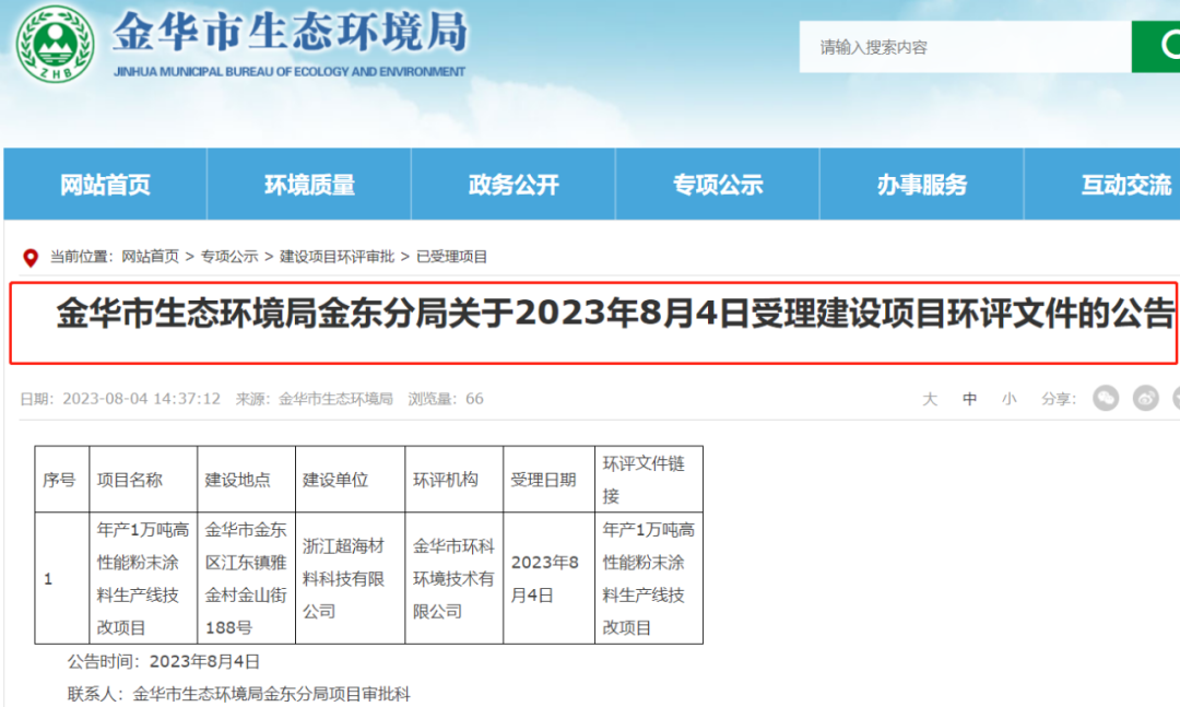 近日,金華市生態(tài)環(huán)境局金東分局對外發(fā)布關(guān)于“浙江超海材料科技有限公司年產(chǎn)1萬噸高性能粉末涂料生產(chǎn)線技改項目”受理建設(shè)項目環(huán)評文件的公告。