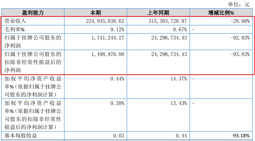 近日,安徽恒泰新材料科技股份有限公司(下稱(chēng)“恒泰新科”)對(duì)外發(fā)布半年報(bào)。根據(jù)披露,2023年上半年恒泰新科營(yíng)業(yè)收入為2.25億元,同比下滑28.66%;實(shí)現(xiàn)凈利潤(rùn)174.12萬(wàn)元,同比下滑92.83%;實(shí)現(xiàn)扣非后凈利潤(rùn)149.9萬(wàn)元,同比下滑93.83%。