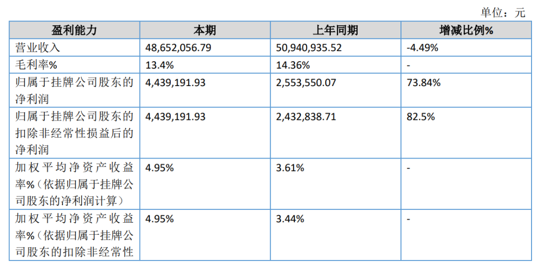 近日,江蘇欣寶科技股份有限公司(下稱“欣寶科技”)對(duì)外發(fā)布半年報(bào)。根據(jù)披露。欣寶科技2023年上半年實(shí)現(xiàn)營業(yè)收入4865.21萬元,同比下滑4.49%;實(shí)現(xiàn)凈利潤443.92萬元,同比增長73.84%;實(shí)現(xiàn)扣非后凈利潤44.39萬元,同比增長82.5%。