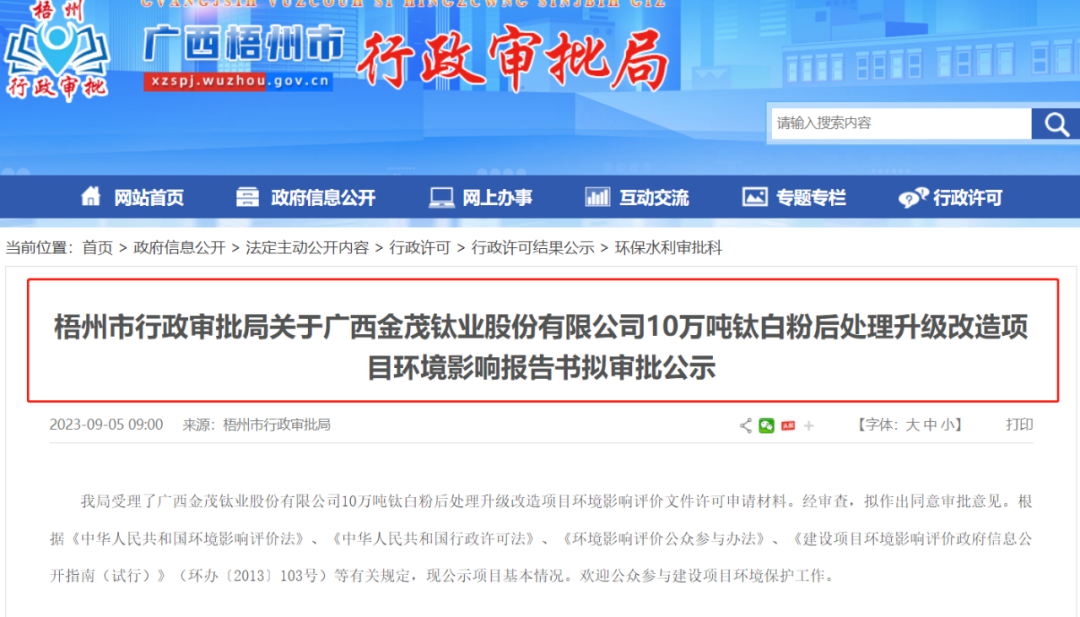 為迎合市場需求,廣西金茂鈦業(yè)股份有限公司(下稱“金茂鈦業(yè)”)擬對現(xiàn)有的10萬噸/年金紅石鈦白后處理項(xiàng)目進(jìn)行升級改造。近日,梧州市行政審批局對外公布《關(guān)于廣西金茂鈦業(yè)股份有限公司10萬噸鈦白粉后處理升級改造項(xiàng)目環(huán)境影響報(bào)告書》擬審批公示。