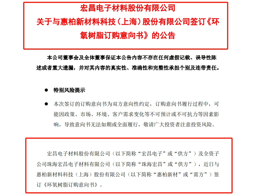 宏昌電子材料股份有限公司(下稱“宏昌電子”)公告,公司(“供方”)及全資子公司珠海宏昌電子材料有限公司(簡稱“珠海宏昌”或“供方”),近日與惠柏新材料科技(上海)股份有限公司(簡稱“惠柏新材”或“需方”)簽訂《環(huán)氧樹脂訂購意向書》。