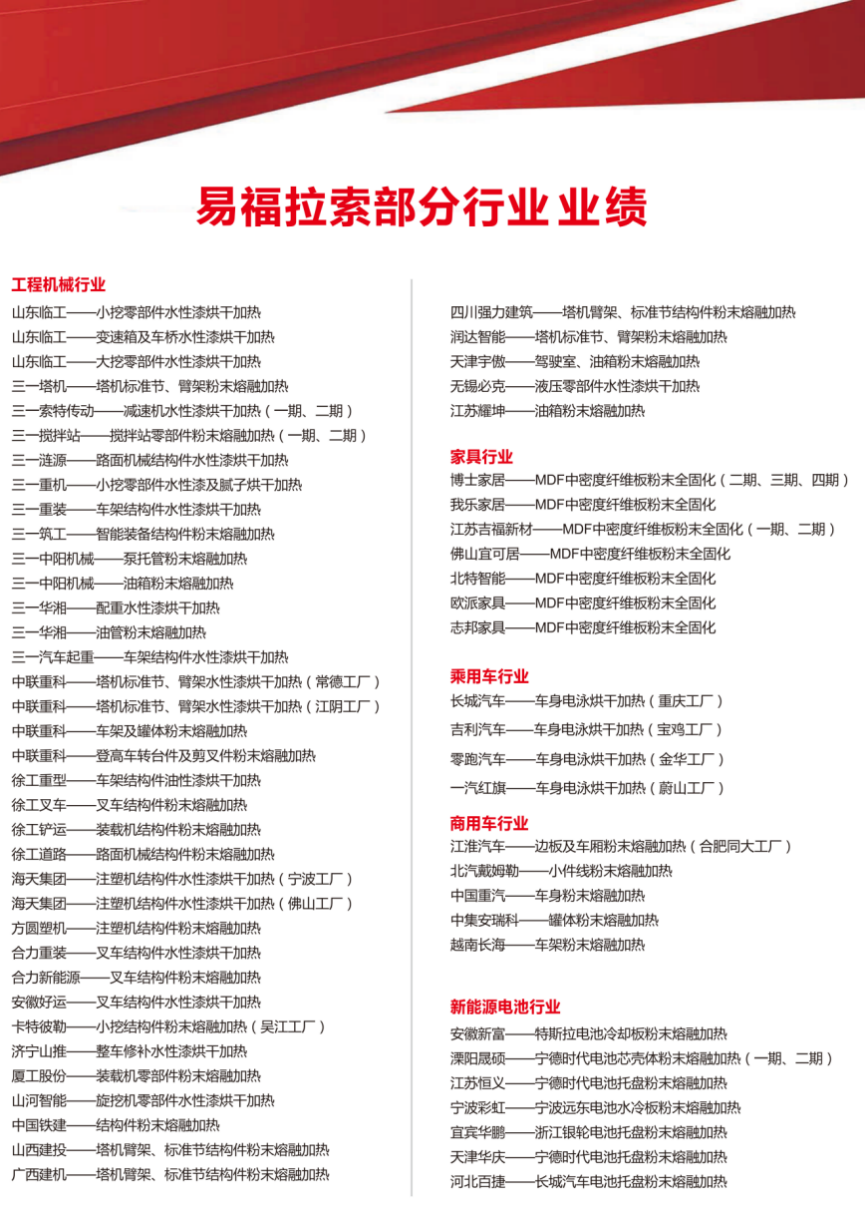 易福拉索憑借其先進(jìn)的技術(shù)優(yōu)勢(shì)和卓越品質(zhì)的產(chǎn)品,贏得了眾多領(lǐng)域客戶的認(rèn)可。其先后將產(chǎn)品成功應(yīng)用于汽車行業(yè)、工程機(jī)械、家具行業(yè)、食品行業(yè)、橡膠行業(yè)、玻璃行業(yè)和紡織等領(lǐng)域,并獲得長(zhǎng)城汽車、吉利汽車、北汽戴姆勒、中集安瑞科、中國(guó)重汽、卡特彼勒、三一重工、徐工集團(tuán)和中聯(lián)重科等知名企業(yè)的認(rèn)可。