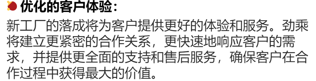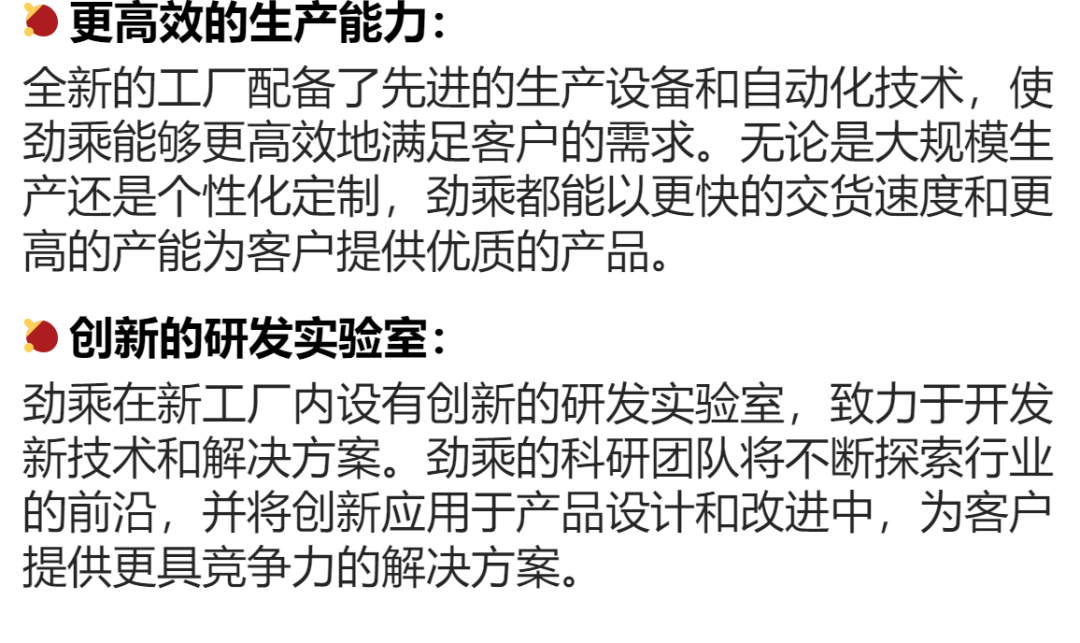 勁乘表示,“我們熱忱歡迎您親臨勁乘新工廠(chǎng),參觀(guān)我們的設(shè)施和生產(chǎn)線(xiàn)。您將有機(jī)會(huì)親眼目睹我們的制造實(shí)力和承諾,深入了解我們的產(chǎn)品和技術(shù)優(yōu)勢(shì)。勁乘新工廠(chǎng)的落成標(biāo)志著我們邁向更美好的未來(lái),我們期待與您共同分享成功的喜悅,共創(chuàng)更加輝煌的明天!”