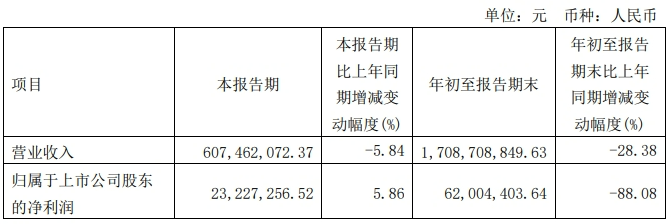 其中,第三季度實(shí)現(xiàn)營業(yè)收入6.07億元,同比下降5.84%;實(shí)現(xiàn)凈利潤2322.73萬元,同比增長5.86%;實(shí)現(xiàn)扣非后凈利潤2213.1萬元,同比增長17.4%。