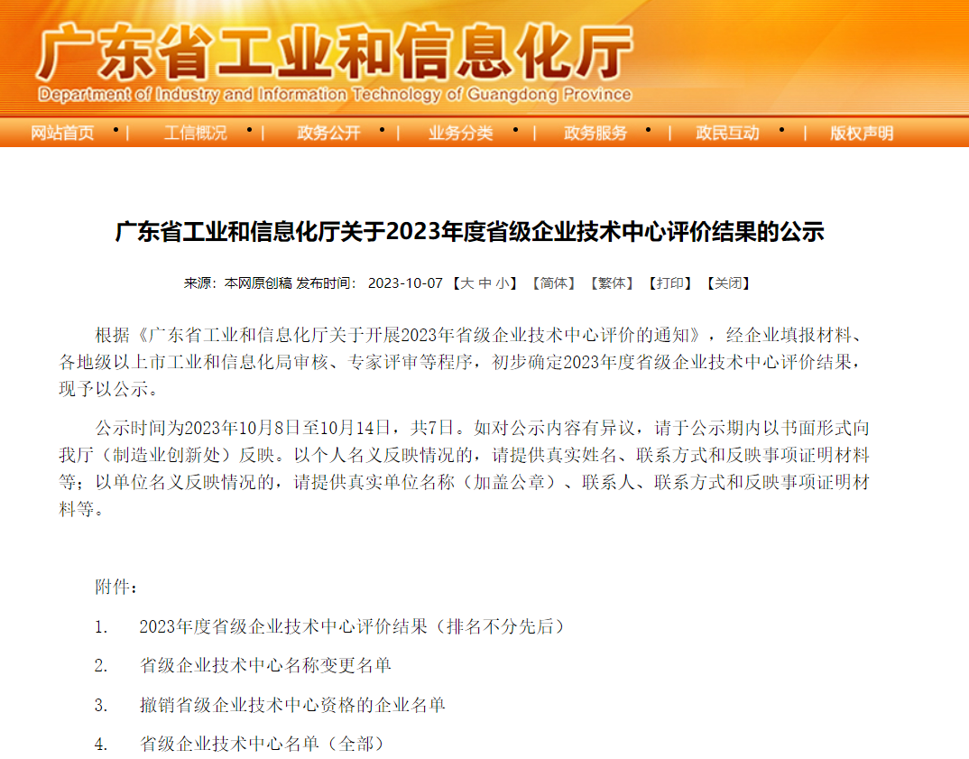 近日,廣東省工業(yè)和信息化廳對外發(fā)布了《關(guān)于2023年度省級企業(yè)技術(shù)中心評價結(jié)果》的公示。