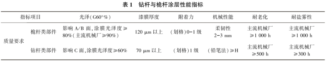 從鉆桿與桅桿粉末涂層性能指標(biāo)參數(shù)可以看出,桅桿對裝飾性能及防腐性能的要求均較高,而鉆桿對裝飾性的要求不高,但防腐性能的要求較高。