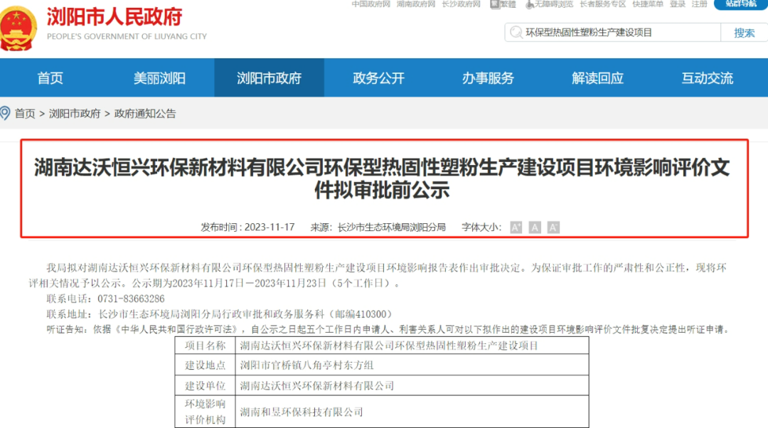 2023年11月17日,長(zhǎng)沙市生態(tài)環(huán)境局瀏陽(yáng)分局對(duì)外發(fā)布《湖南達(dá)沃恒興環(huán)保新材料有限公司環(huán)保型熱固性塑粉生產(chǎn)建設(shè)項(xiàng)目環(huán)境影響評(píng)價(jià)文件擬審批前公示》。公示期為2023年11月17日-2023年11月23日(5個(gè)工作日)