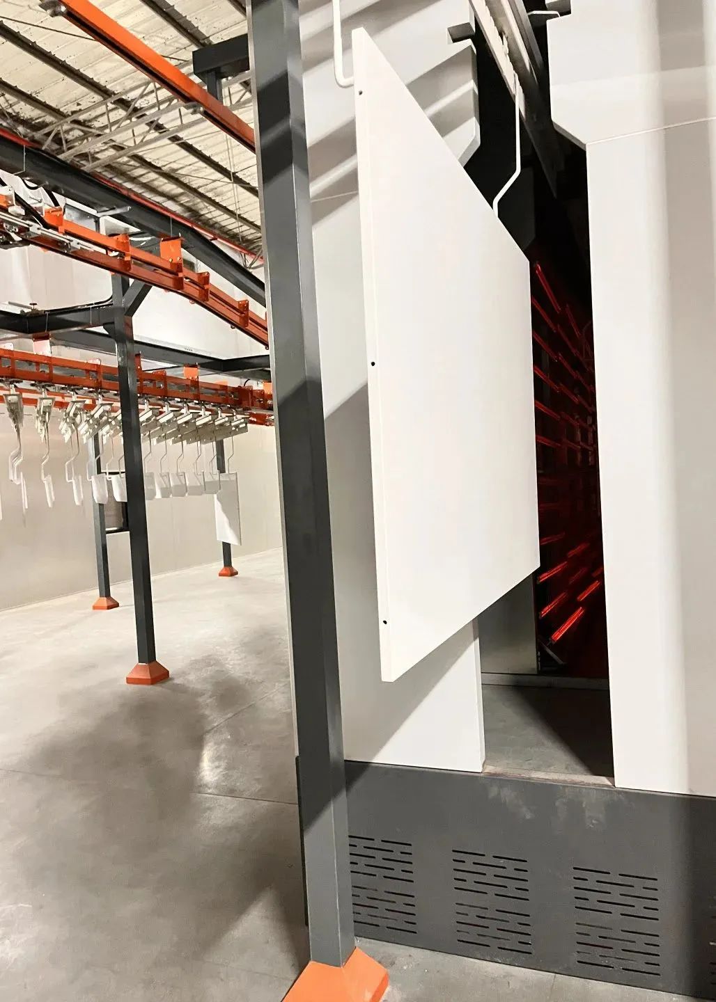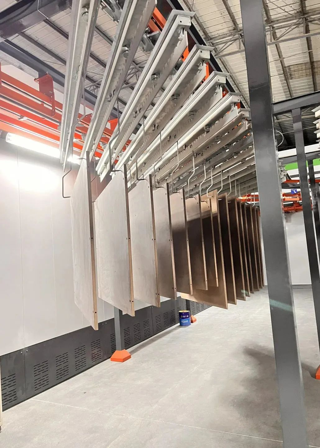 這條全新的MDF粉末噴涂生產(chǎn)線采用了數(shù)字固化系統(tǒng),可調(diào)式積放鏈系統(tǒng),雙粉房固化系統(tǒng),一體化集成系統(tǒng),魔術(shù)快速換色系統(tǒng),以及智能化冷卻系統(tǒng)。具有高效率、高精度、高穩(wěn)定性的特點??赏瑫r噴至少兩種顏色,同步噴粉和同步固化,更柔性、效率更高,產(chǎn)能可實現(xiàn)1500平方/天。